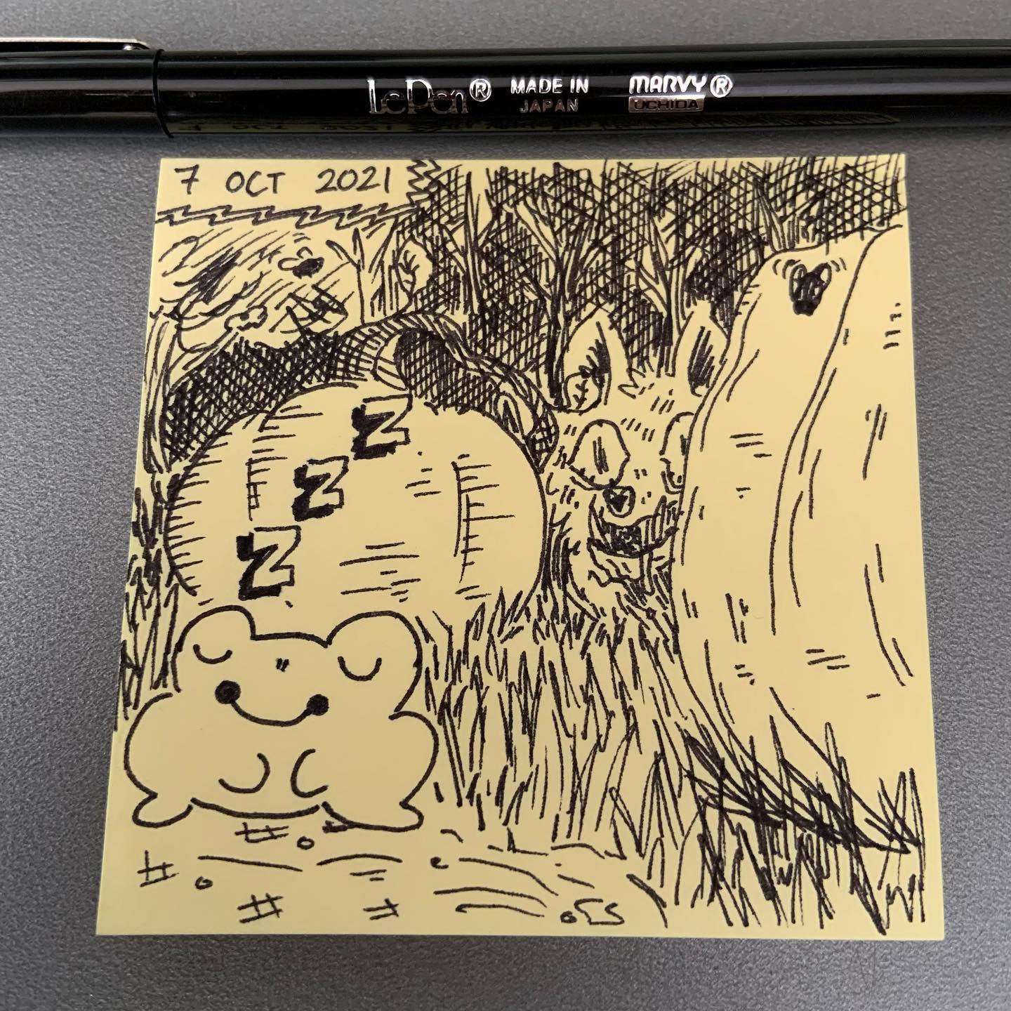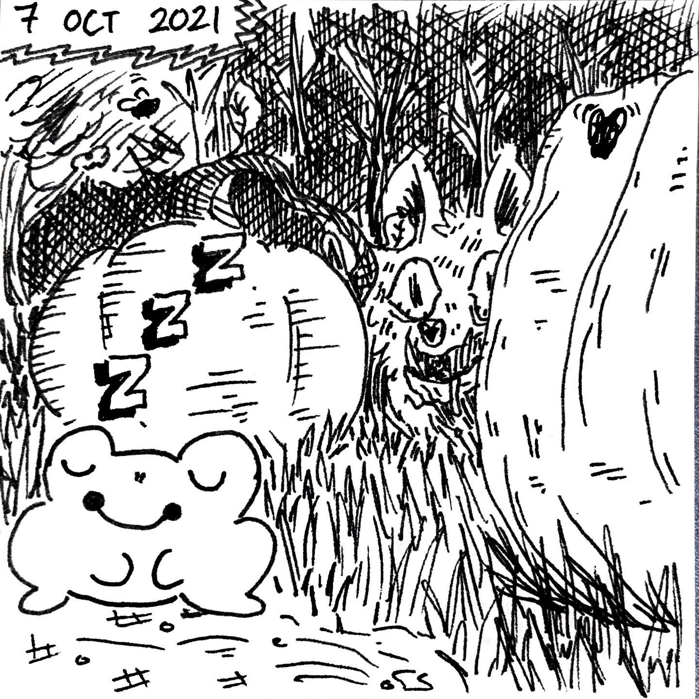 Inktober Day 7!!!!!!! âââââââââââââââââ I wanted to mix some cute with some scary but donât worry Federico the Frog and Wilma the Wolf are good friends and Wilma is just looking at the tasty bowl of fruit off-screen to the side of Federico. âºï¸âºï¸âºï¸ #Inktober #Inktober2021 #Inktober2021day7