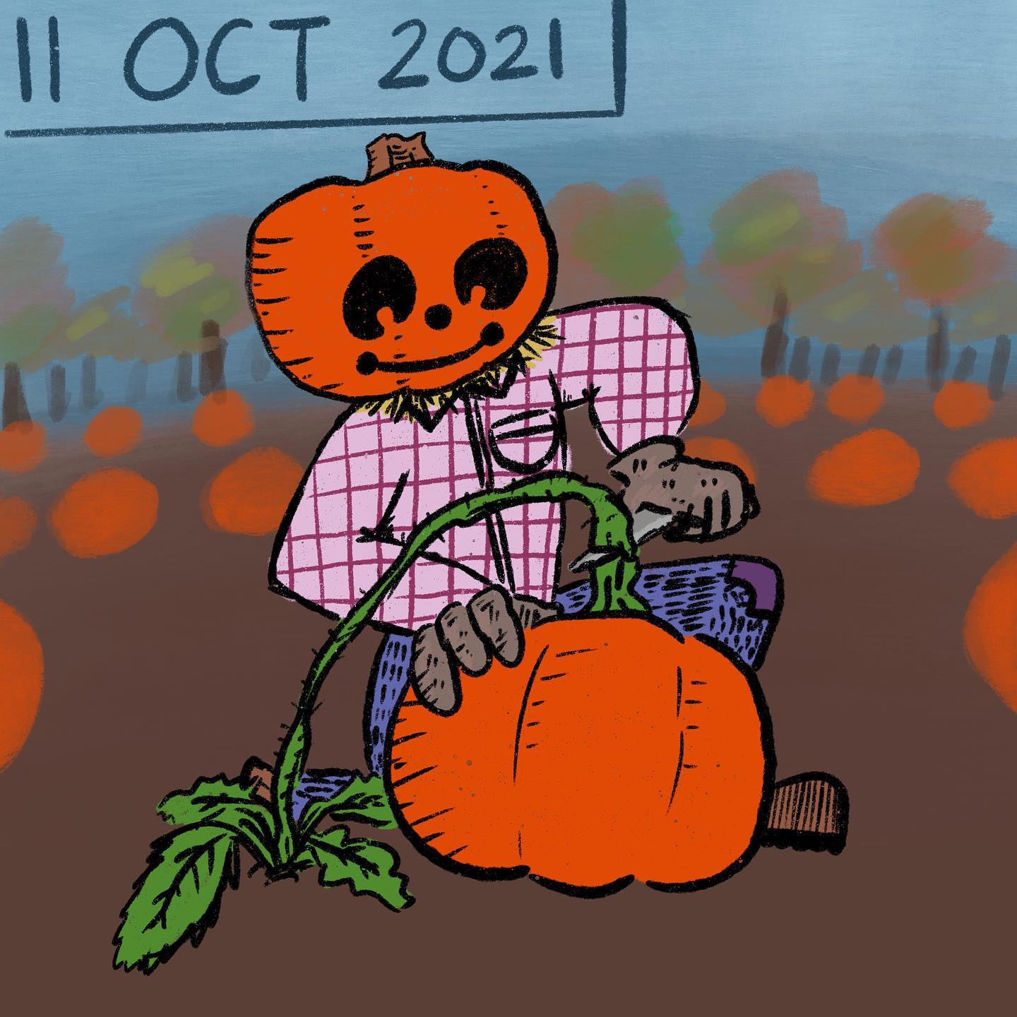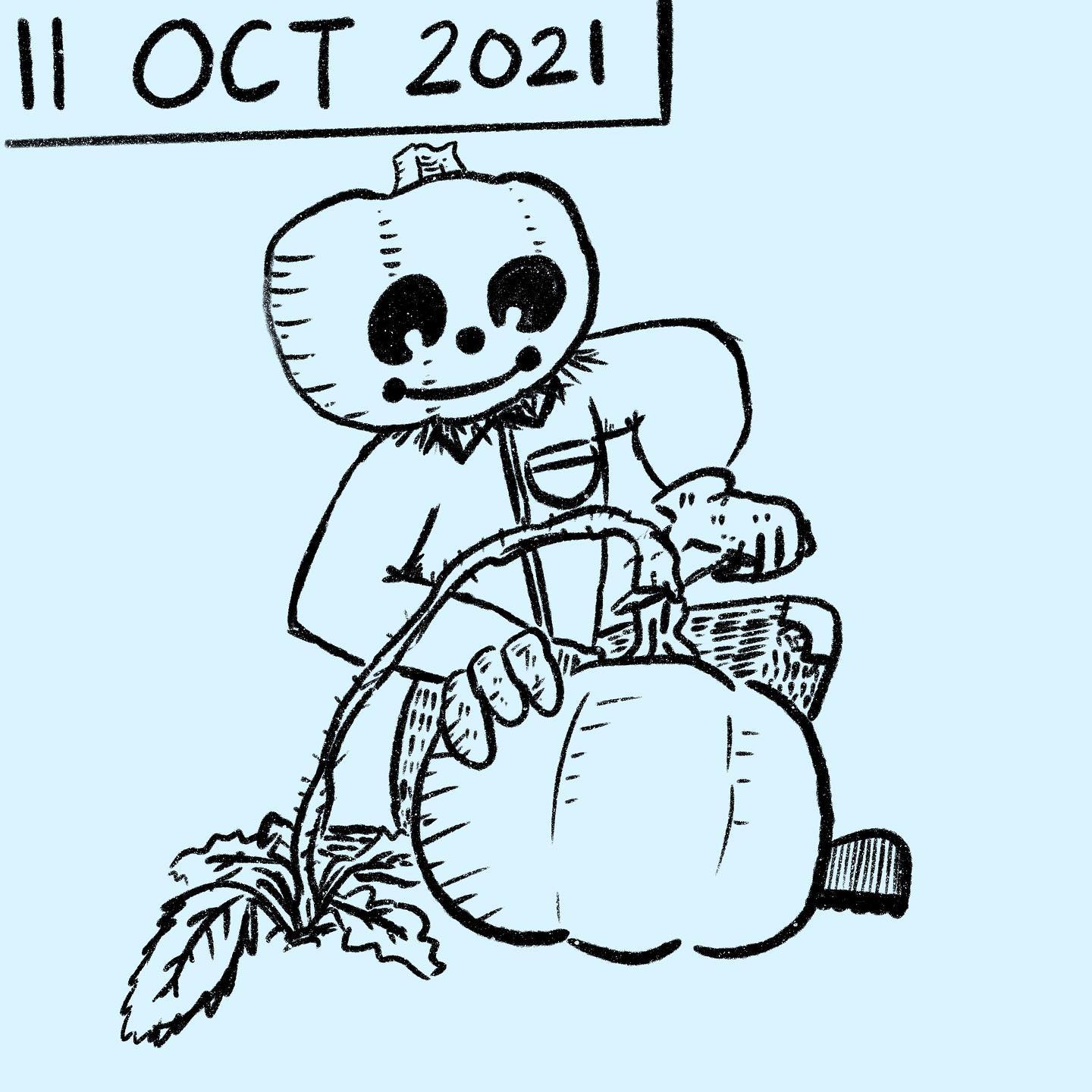 Inktober Day 11!!!!!!!!!!! ââââââââââââââââââ Whoops! I missed the past couple of days for Inktober but donât worry hereâs a very special Inktober post that I hope you enjoy. This one was done digitally and I got to try new things with the colors, layering, and background. I spent more time on this post than I usually do with the sticky notes since I was able to undo things and move layers around though I hope the style isnât too different. Anyways, is it a scary thing to have a pumpkin person harvest a pumpkin? #Inktober #Inktober2021 #Inktober2021day11