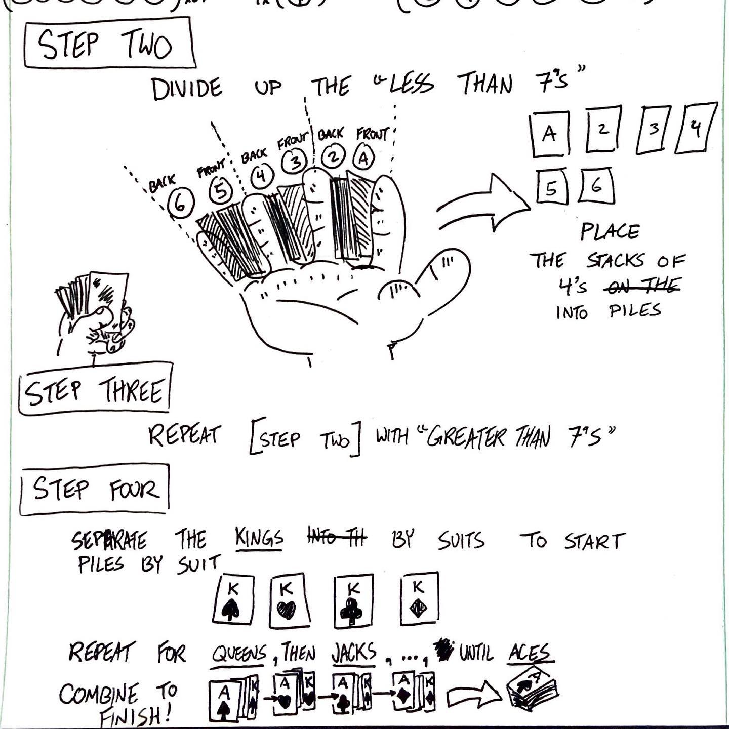 Every time I try to sort playing cards I keep thinking there has to be an efficient way to do this, and I think I came up with a pretty good method! Itâs similar to the âQuick Sortâ algorithm commonly used with computers, and adapted for human hands. You start by diving the deck into three piles, then for each pile, split each rank into its own pile of 4 suits, THEN you use the kings to start a new stack for each suit which you add onto using each rank pile until its all sorted!