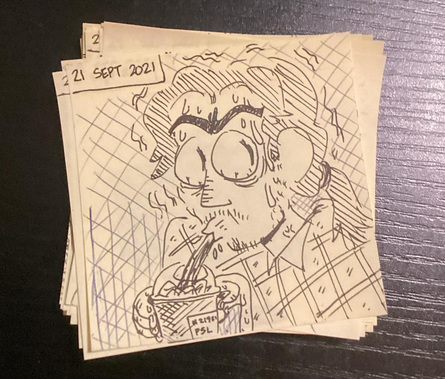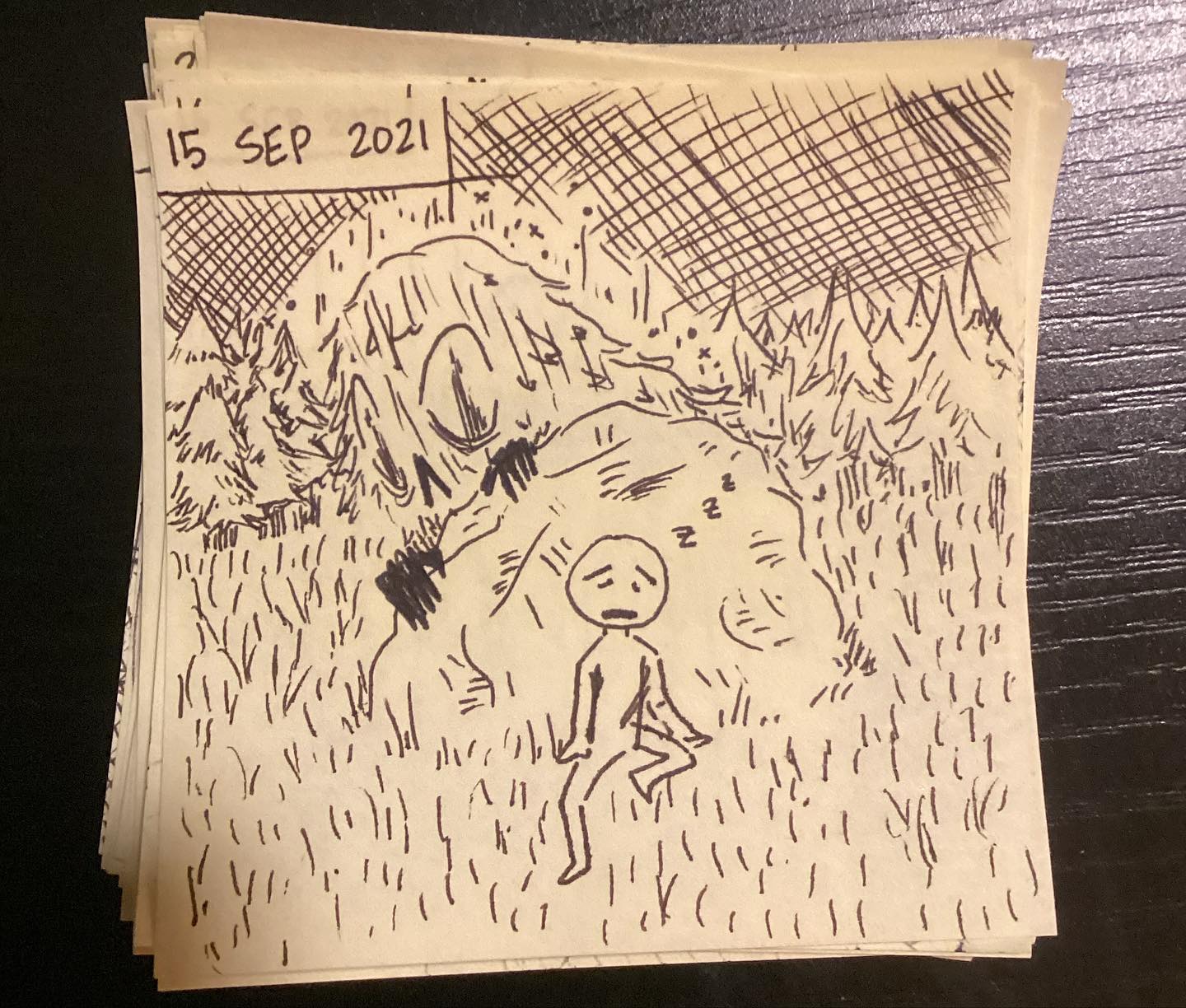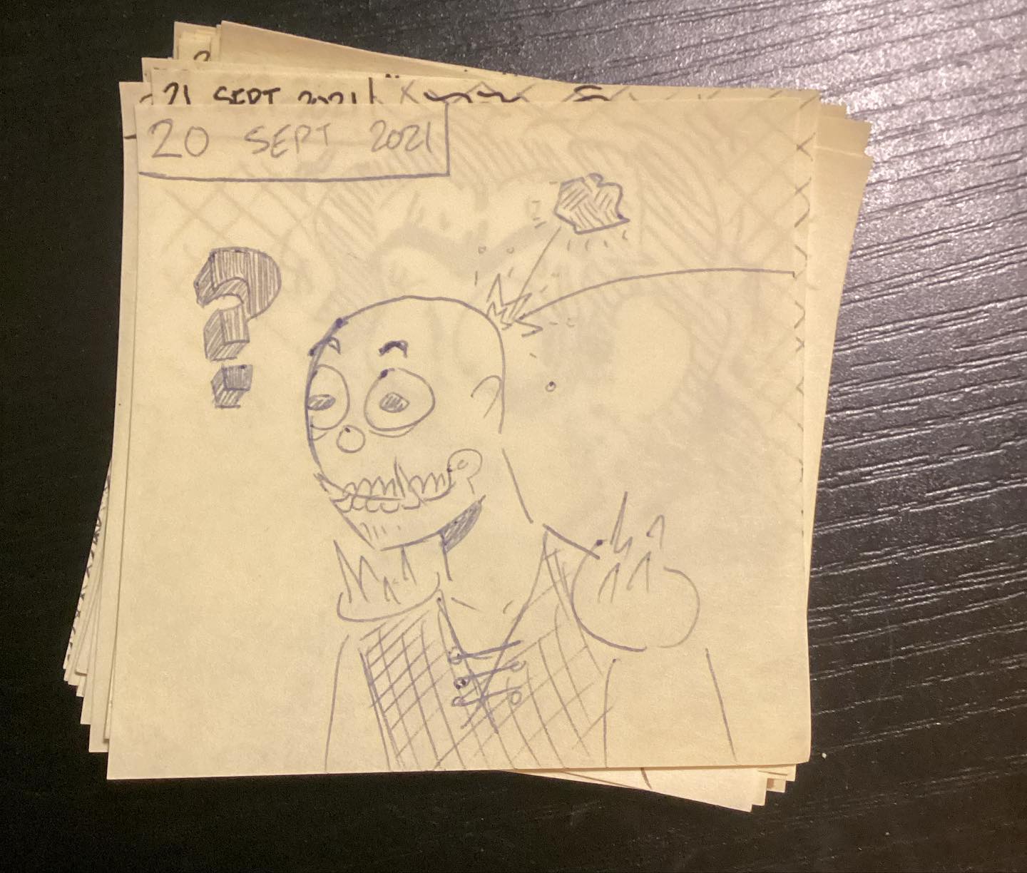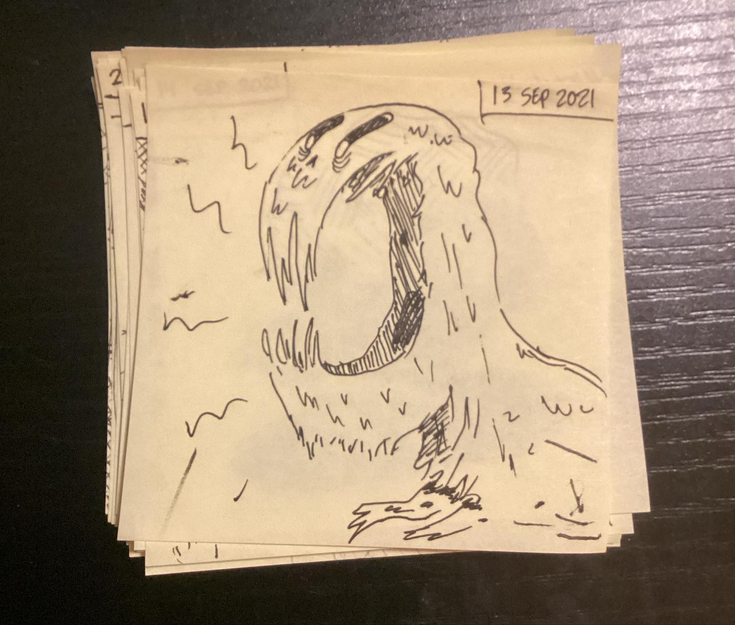 2021 September 13-23 You might remember some of these from earlier posts, but this past year I kept a wall at my work desk where I tried drawing a sticky note whenever I was there, and so now I will post them all for you all at once!