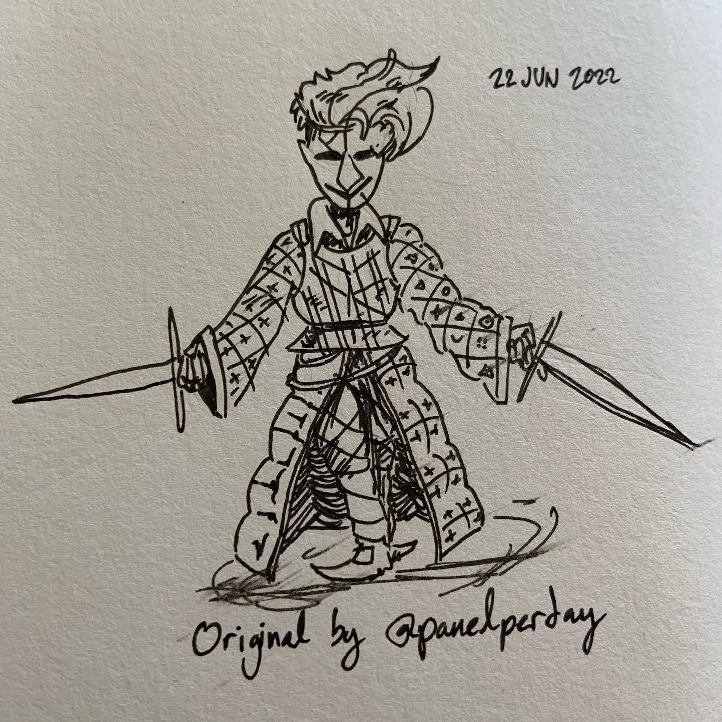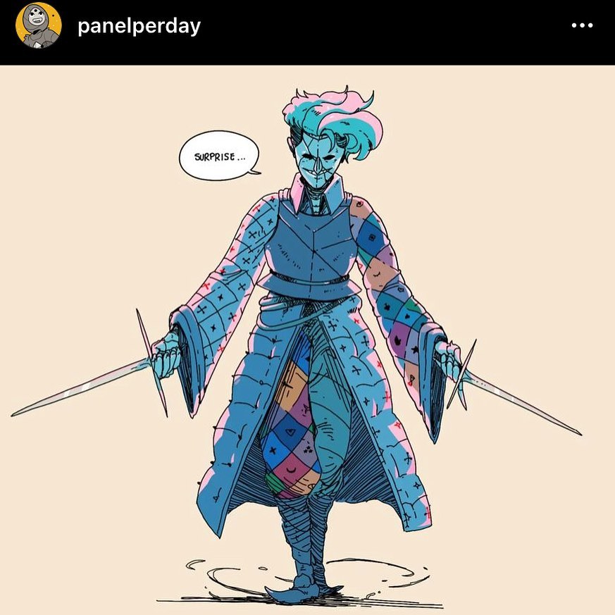 I felt inspired by one of my favorite designs from @panelperday :D Itâs not a perfect recreation of the original Harlequin but redrawing it made me realize some clever details in the design like how the soft and hard materials are different in how straight their lines are. The hard angled lines of the metal are distinct from the cracked lines of the porcelain and both are distinct from the soft bendy lines of the cloth. I know its probably obvious that those lines are like that but I just love the little details like that showing you what the material is like ð