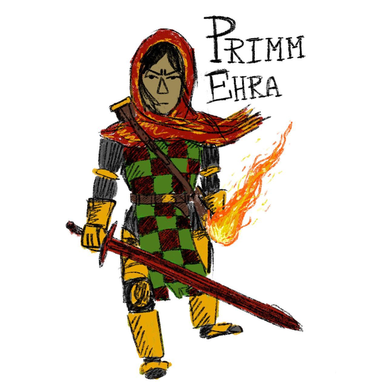 A loose interpretation of my Elden Ring character also I like to name my characters based on the order they were made. When I played Dark Souls 3 I kept accidentally losing all my save data so I would name them like Scrimbleton the Second, Brimblio the Third. But now in Elden Ring I only have one character so far and so her name is a pun on âPrimeraâ which is Spanish for first