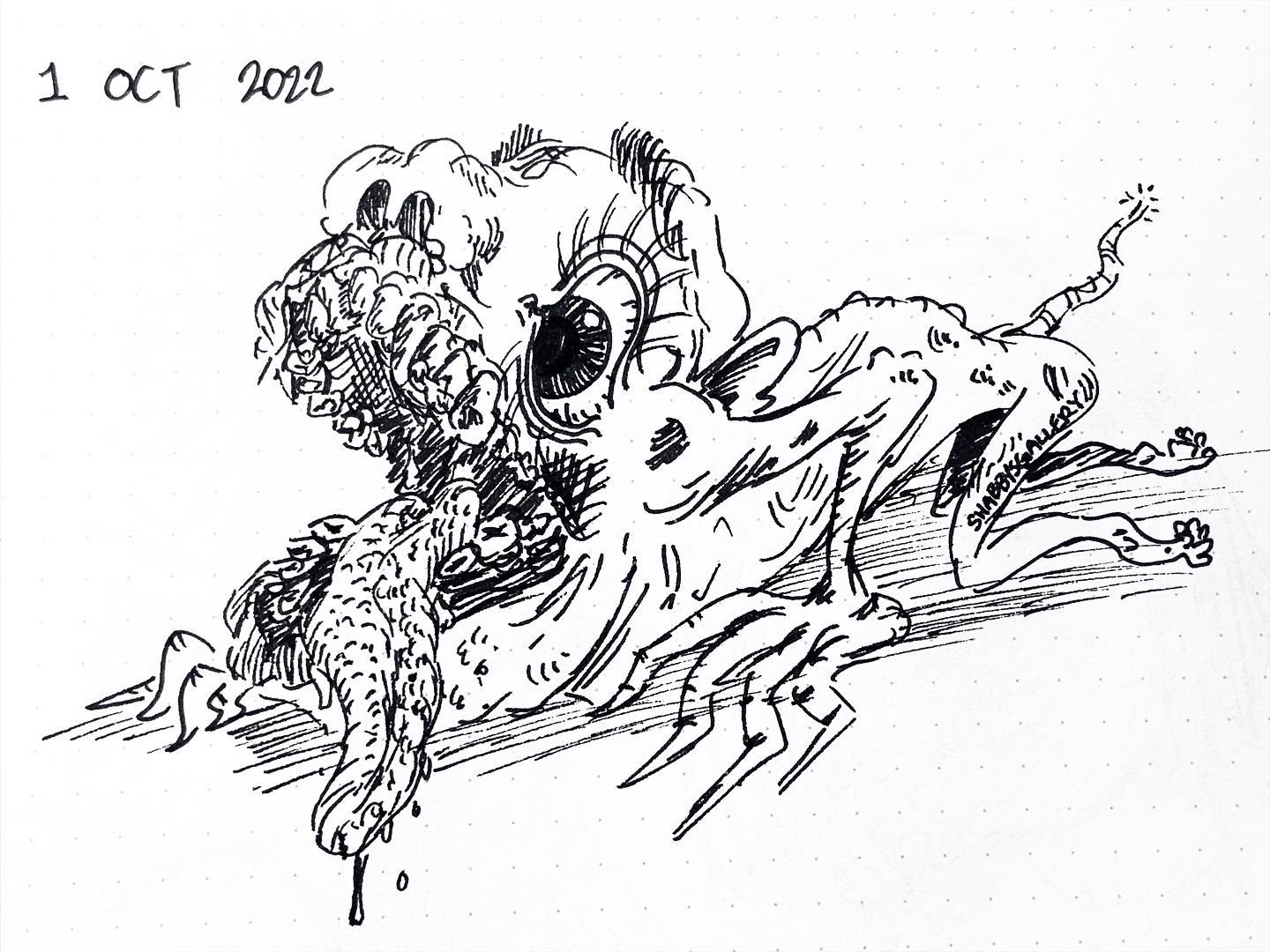 Inktober Day 1! This month if thereâs every a day I donât know what to draw, Iâll just draw some circle or line idk you get what you get. Todayâs drawing is inspired by the dread and frustration I feel of feeling like I canât express my concerns and worries and feeling like thoseâll continue to be suppressed and ignored by the masses and like maybe itâs like iâm some hideous monster to be shunned away from all and my demise would be celebrated by those who feel uncomfortable with my existence but like in a metaphorical sense not actually me just like