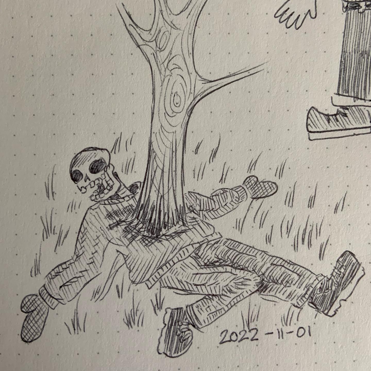 today I thought, âhmm a ballpoint pen, I havenât used that in a whileâ and âwouldnât it be sick if there was a tree growing out of a corpse and the clothes kinda covered up the bones so you wouldnât know for sure if it was dead until you saw the skullâ