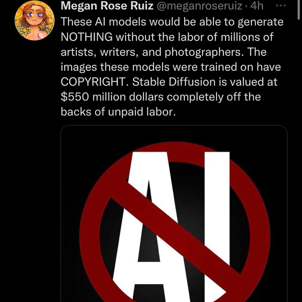 AI Art is derived from art that actual artists make. They never gave you permission to use their art, your AI Art is just mashing together other peopleâs art and calling it your own. @meganroseruiz has a post that goes into further details, if you would like to learn more, please visit her page